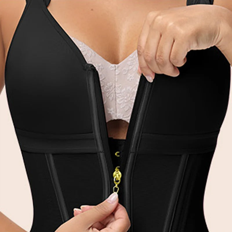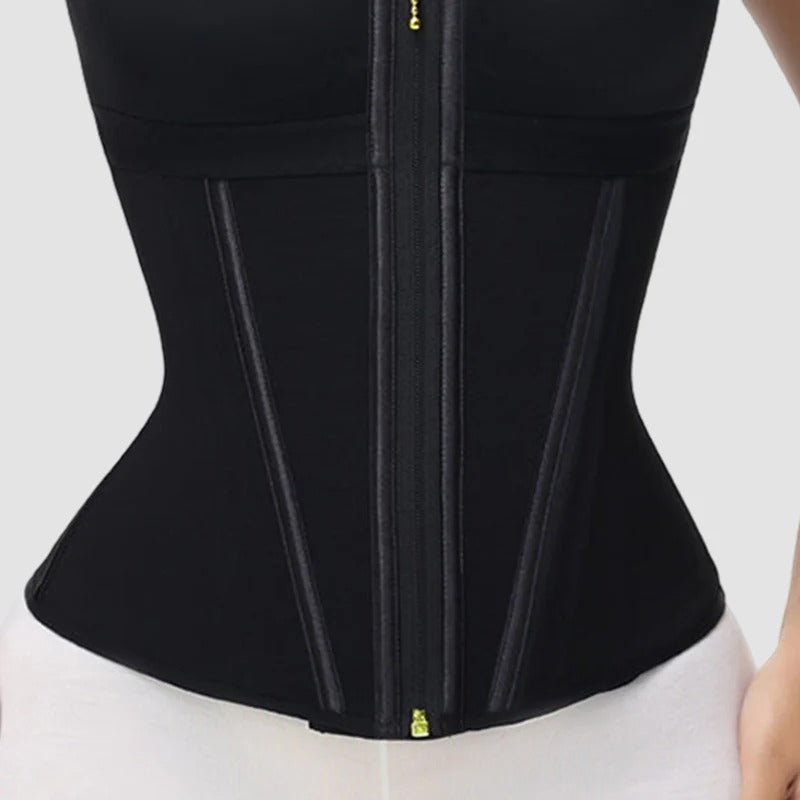Double-layer compression (inner hooks + outer zipper) flattens stubborn lower belly while steel boning cinches the waist. Move freely with breathable rigidity that never digs.